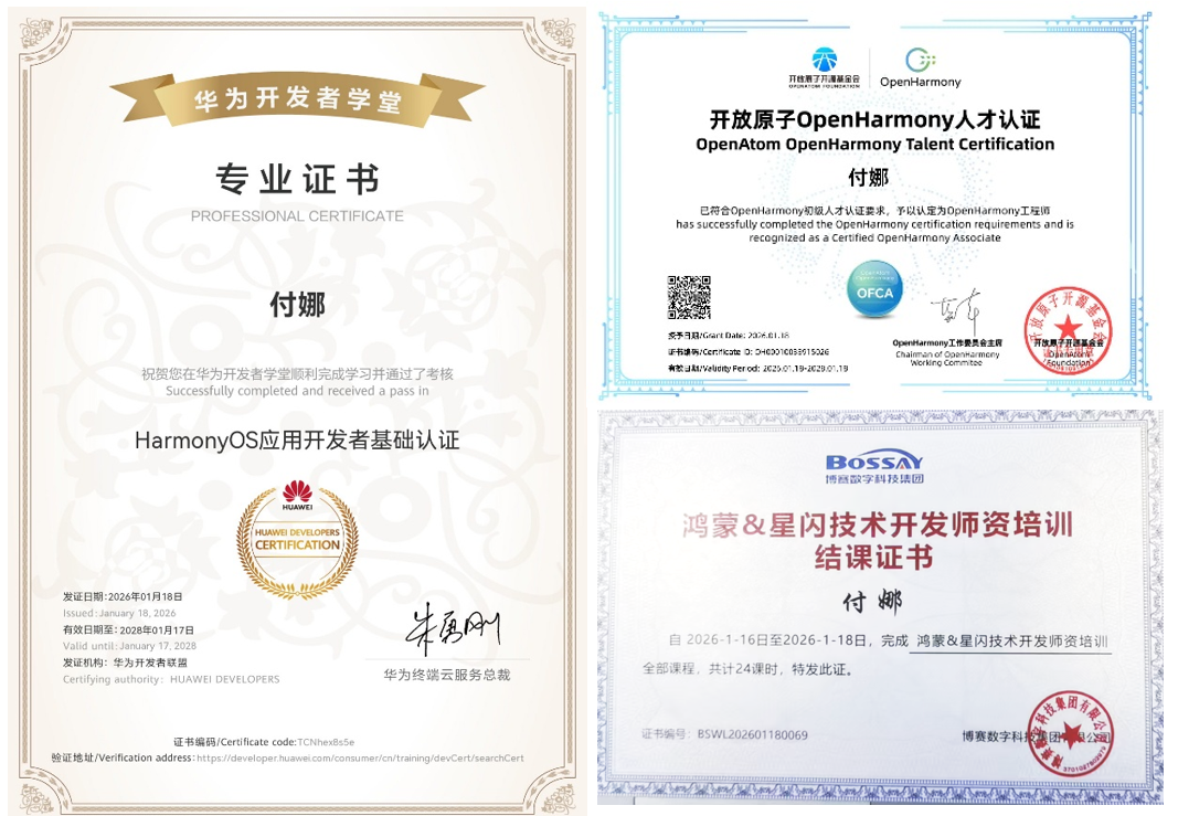 本次培训还为考核合格的教师颁发了开放原子开源基金会“OpenHarmony人才认证证书”与华为开发者学堂“Harmony应用开发者认证证书”,付娜老师顺利通过考核并获得双认证,进一步提升了公司在信息技术领域的团队水平与行业影响力。
