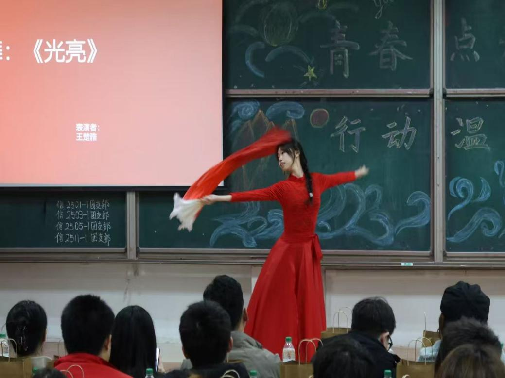 活动在合唱《起风了》的轻快旋律中拉开帷幕,蓬勃的歌声瞬间点燃现场氛围。紧接着,独舞《光亮》里,舞者似寒冬里跃动的暖光传递着向上的力量。独唱《萤火星球》以温柔声线诠释“微小光芒亦能汇聚温暖”的主题。随后,相声《手机拖延症》则用幽默表演引发学子对“高效服务社区”的思考。互动环节“红歌猜猜猜”将氛围推向高潮,同学们踊跃抢答,在熟悉的红色旋律中重温奉献精神,笑声与歌声交织成冬日里的暖流。朗诵《以青春之名 暖社区之冬》以铿锵语调诉说青年服务社区的信念,合唱《我相信》《日不落》以集体之声传递“以行动暖寒冬”的决心。最后,独舞《恰恰组合》的灵动与陶笛合唱《相亲相爱》的温情,为整场活动画上了圆满的句号。
