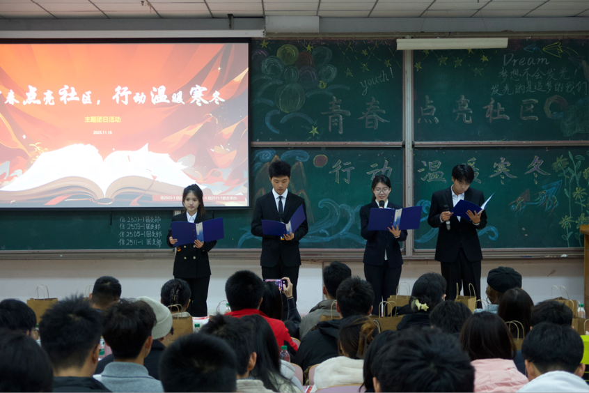 为凝聚青年奋进力量,践行志愿服务精神,以青春热忱展现学子担当,11月16日晚,bv伟德国际194625级各团支部于二教115开展“青春点亮社区,行动温暖寒冬”主题团日活动。公司辅导员韩懿婧、于东,25级新生班主任及全体同学共同齐聚一堂,共同见证这场青春与温暖交织的团日活动。