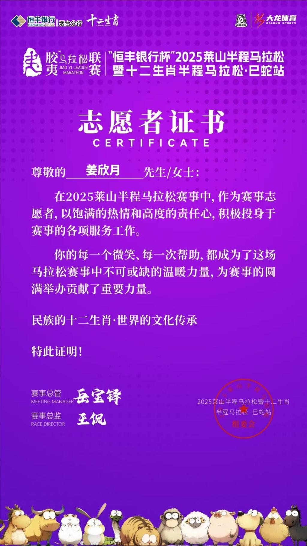姜欣月始终踊跃投身于公司、公司及班级组织的各类志愿服务工作。她吃苦耐劳、富有责任感,认真对待每一次的志愿服务活动。作为员工干部,她积极参与公司组织的我为同学办实事志愿活动,进行禁烟活动宣传,电脑义诊等。并积极走出公司,参与莱山图书馆七彩小屋活动、烟台市马拉松各赛项志愿者,被评为烟台市优秀志愿者。