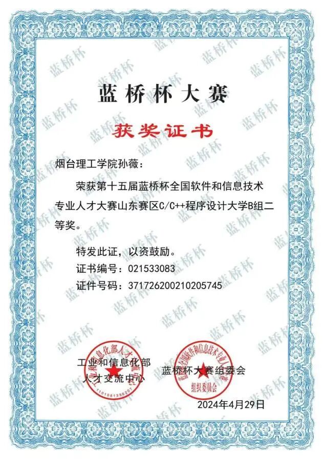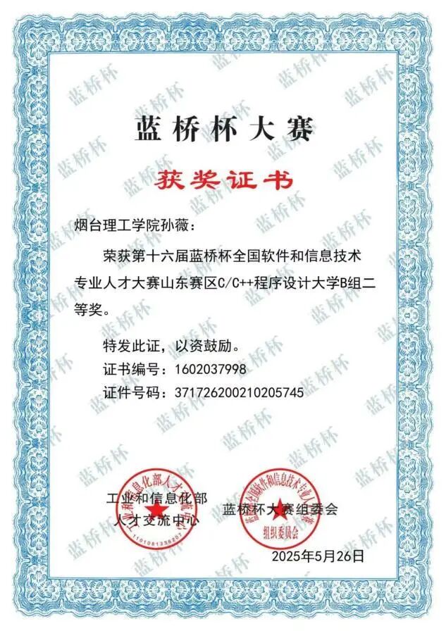 备战蓝桥杯时,她常泡实验室拆解案例、打磨算法。第十五届凭精准编程获省级二等奖,第十六届再续佳绩,同样拿下省级二等奖。
