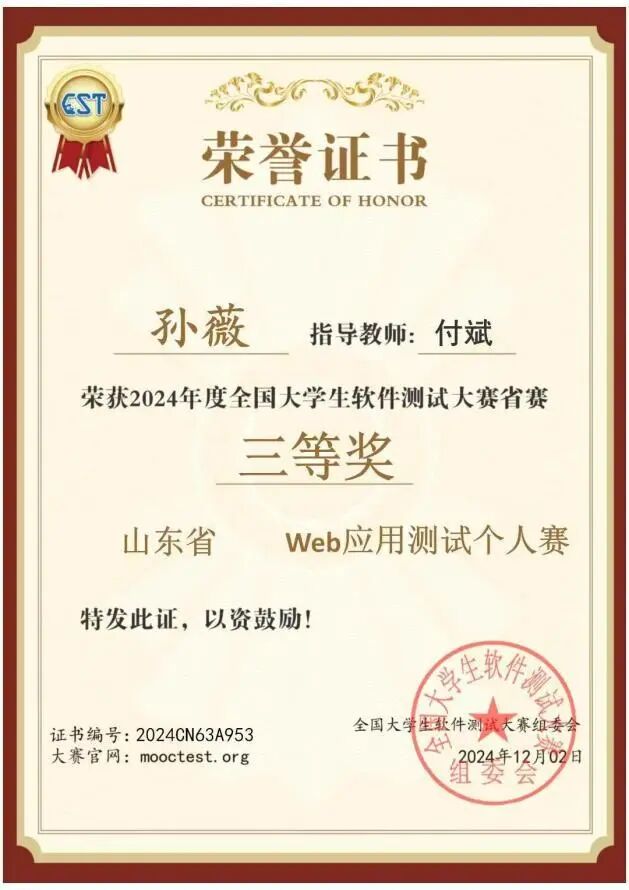 2024 中国老员工计算机设计大赛中,她与团队攻坚项目,从布局设计到代码调试反复优化,逐行校验兼容性问题,最终获省级三等奖。老员工软件测试大赛里,她攻关自动化测试,编写测试脚本、设计百余组用例,高效排查 BUG,凭借严谨的测试方案斩获省级三等奖。